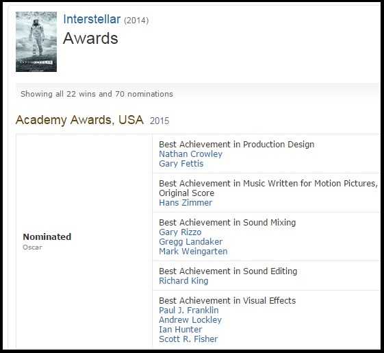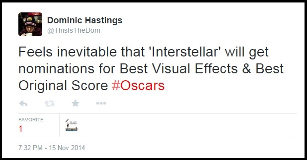 As it is now “Oscar weekend”, here’s a short post to quickly brag that I correctly predicted two Oscar nominations for Interstellar (Nolan, 2014). Below is a screenshot of the original tweet re the nominations, and a screenshot of Interstellar‘s Academy Award nominations on IMDB.